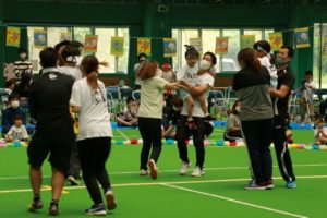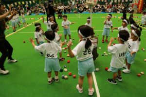 音楽が鳴ったらダンス、音楽が止まったら玉入れのシンプルな競技。ダンス好きの子どもたちが輝く瞬間です笑