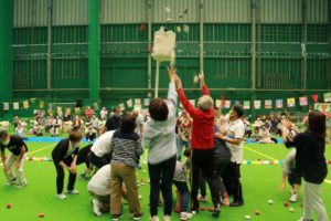 音楽が鳴ったらダンス、音楽が止まったら玉入れのシンプルな競技。ダンス好きの子どもたちが輝く瞬間です笑