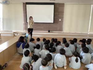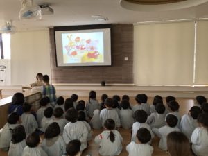 →その後は、室内へ移動し、きりん・こあら・うさぎ・ぱんだ組さんは紙芝居を聞きました。