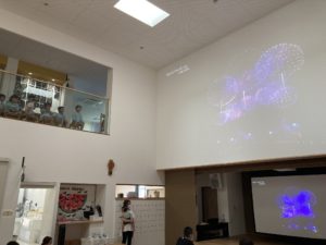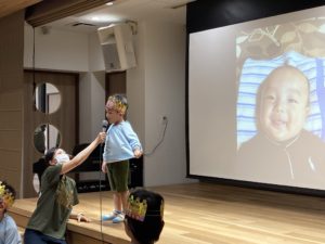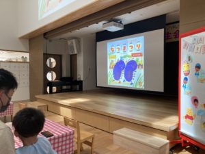 今月は、新型コロナウイルス感染拡大防止のためホールには誕生児の保護者の方のみ座っていただき、セカンドのお友達は2階からお祝いしました。