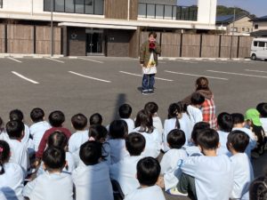『ひよこ組から火事です。第一駐車場へ避難しましょう』
