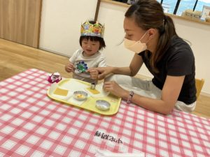誕生児の子どもたちもイチゴやろうそくを貼ってお手伝い(^_^)