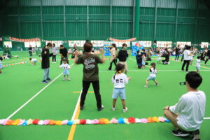 3歳以上児は赤・青・黄色チームに分かれ色別対抗で競技を行います!さぁどのチームが優勝するかな?