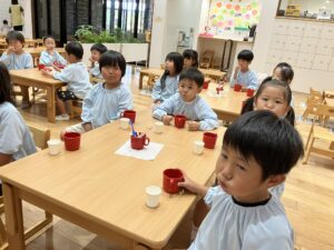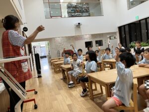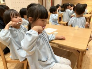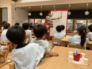 今日は歯科指導の先生方が来てくださり年長・年中クラスの子どもたちに正しい歯磨きの仕方を教えてくださいました!歯科指導は年に2回、保健センターより歯科衛生士さんが来られて、子ども達に歯の大切さを分かりやすく伝えて下さいます。