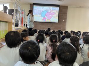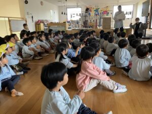 2歳児~5歳児クラスのお友達はプレイルームに移動してDVDでお勉強。
