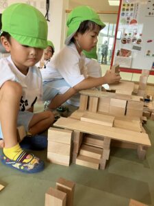 積み木で水族館を作って表現。すごい集中力です。