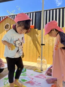 1歳児さんも園庭で色水遊びや、室内で色塗り遊びやシール貼り遊びをして過ごしましたよ(^^)