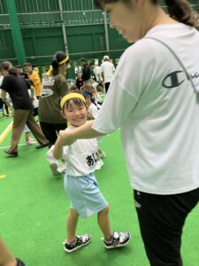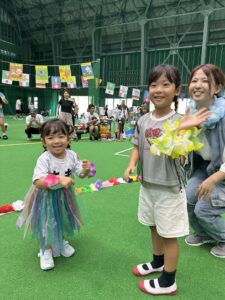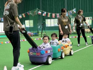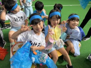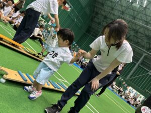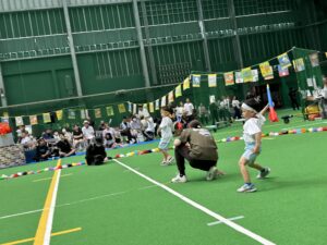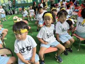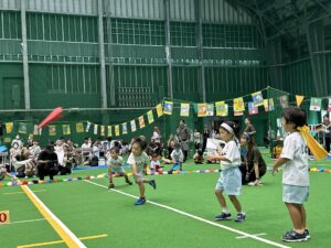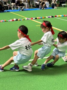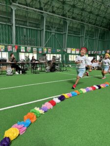 3歳以上児は異年齢のチームでの国別対抗で戦い、年長児がリードし、年下のお友達を助ける姿、また、年下のお友達は年長さんを憧れの眼差しで見る姿もあり、助け合いながら一丸となってどの種目にも最後まで頑張って参加していました!