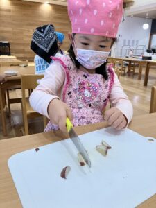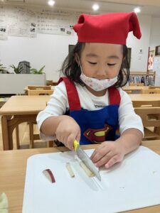 包丁でお芋を切ります。猫の手でそぉっとゆっくり(*^^*)