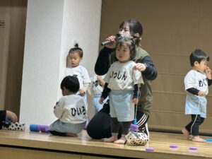 1歳児りす組の子どもたちが普段のおままごと遊びの様子をステージで♪