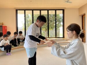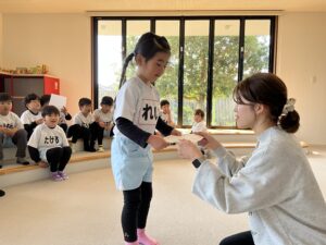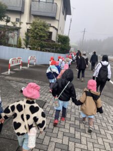 今日の大地の日では、日頃の保育の中で行っている“散歩”での歩行の成果を十分感じられる時間となりました。