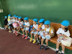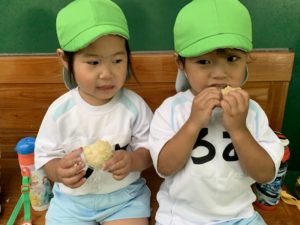→ぱんだ組さんは帰園し、3・4・5歳児の子どもたちはサンドーム前で昼食タイム☆